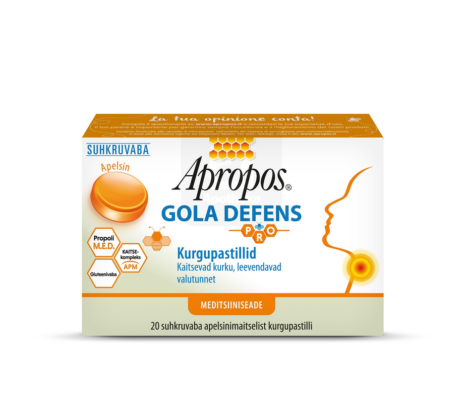 Благодаря пленкообразующему действию и наличию прополиса M.E.D.® таблетки Apropos Gola Defens защищают горло от внешних воздействий, уменьшая болезненные ощущения при раздражении горла, характерные для фарингита и тонзиллита.