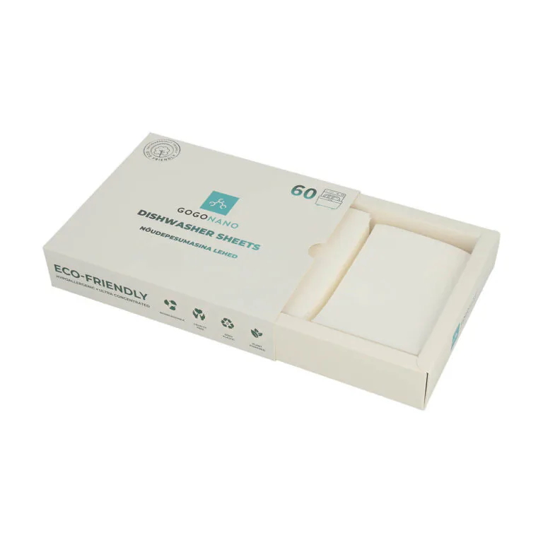 Посудомоечные листы GoGoNano приносят простоту и экологическую чистоту на вашу кухню. Наши умные инновационные листы для посудомоечных машин без аромата обеспечивают мощную очистку без пластмассовых отходов. Каждый предварительно дозированный лист легко удаляет жир, пятна от кофе и чая, а также застывшие остатки пищи. Листы растворяются всего за 30 секунд – независимо от того, горячая или холодная вода – оставляя посуду сверкающе чистой без остатков порошка или геля. Формула без аромата обеспечивает натуральную чистоту без химического запаха.