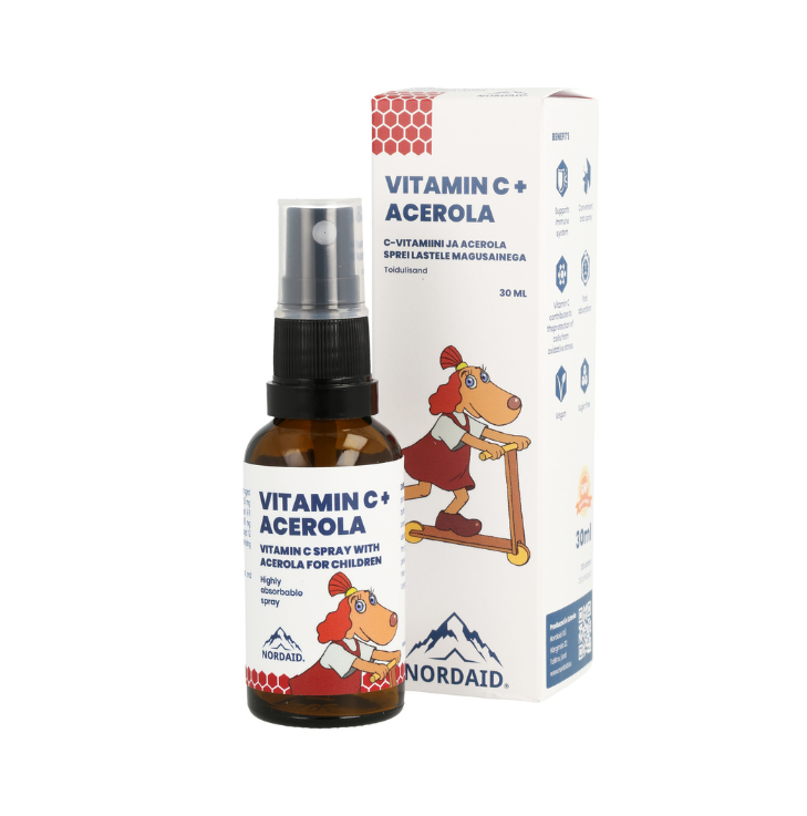 1 распыление содержит 50 мг витамина C (62.5%*), 3 распыления содержат 150 мг витамина C (187.5%*), 5 распылений содержат 250 мг