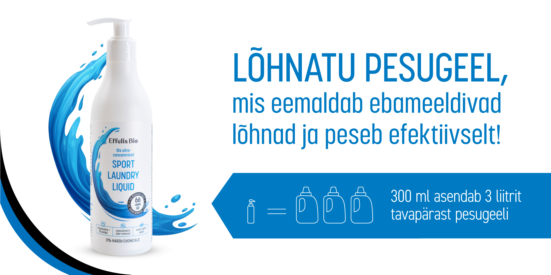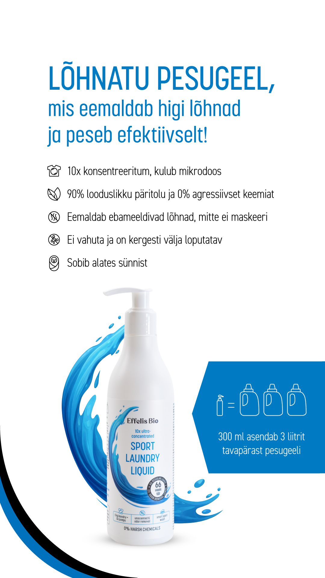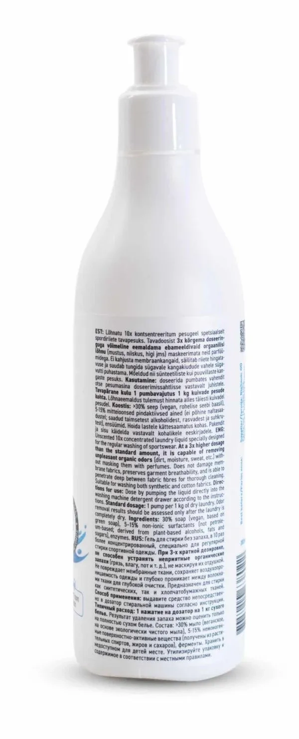 - Гель для стирки без запаха для спортивной одежды, способный дезодорировать неприятные запахи (грязь, влага, пот, моча) с уровнем дозировки в 3 раза выше обычного. Уникальный и специально разработанный в Эстонии рецепт геля для стирки, способный удалять органические запахи на молекулярном уровне, не маскируя их другими ароматами.