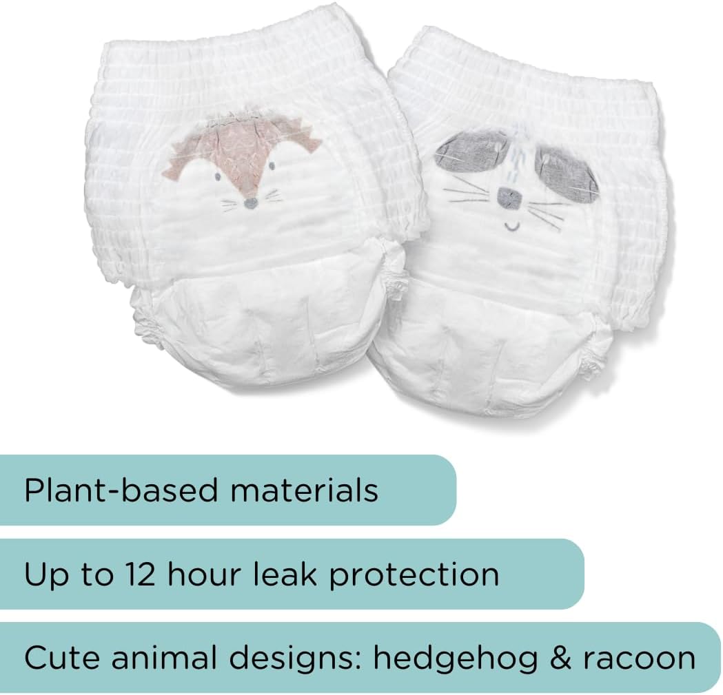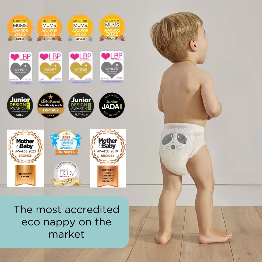 Мягкие внутренний и внешний слои подгузника сделаны из натуральных растительных материалов. Впитывающий слой выполнен из древесной целлюлозы, не обработанной хлором, что обеспечивает защиту от протекания до 12 часов. Передняя панель, застежки, защитные барьеры от протечек и упаковка выполнены из биоразлагаемых материалов, разлагающихся за 3–6 лет. Эластичный пояс адаптируется к телу и движениям малыша.