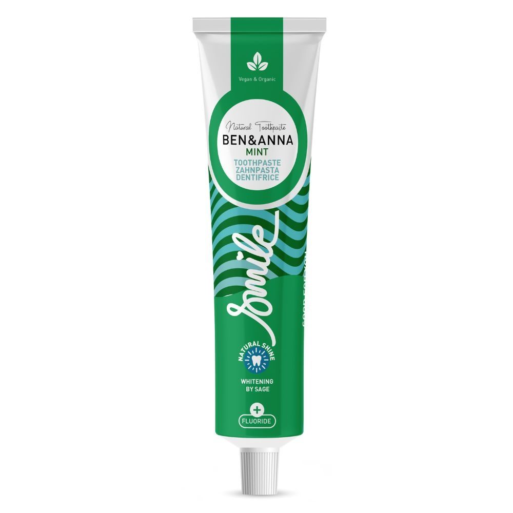 n nМятный вкус. Сертифицированная натуральная косметика Natrue: натуральные ингредиенты для здоровых и белых зубов. Зубная паста с фтором (1450 ppm) способствует профилактике образования зубного налета и кариеса.n nОснователи немецкой компании Ben&Anna, Анна и Бен, которые являются партнерами как в работе, так и в жизни, разработали эту линию косметики исходя из необходимости дезодоранта без обычных алюминиевых солей, парабенов и фталатов, присутствующих в стандартной косметике, и с упаковкой из биоразлагаемых материалов. Косметические продукты Ben&Anna не тестируются на животных, подходят для веганов и содержат только проверенные натуральные ингредиенты.n nДля Анны и Бена также крайне важно сокращать использование пластика, поэтому вся продукция бренда упаковывается в биоразлагаемую бумагу или перерабатываемые стеклянные и алюминиевые контейнеры. Каждая покупка продукции Ben&Anna поддерживает природоохранную организацию One Earth – One Ocean, которая посредством специализированных судов очищает океаны от пластикового мусора и направляет его на переработку. Присоединяйтесь к Анне, Бену и Ben&Anna и делайте ваш дом без пластиковых отходов!n nСостав: Aqua (вода), гидратированный диоксид кремния, глицерин, гидрогенизированный крахмальный гидролизат, экстракт листьев алоэ барбадензис, эритрит, лаурилглюкозид, ароматизатор, ксантановая камедь, лимонная кислота, натрия фторид, масло листьев мяты луговой (Mentha Arvensis), экстракт стевии, лимонен, бензоат натрия, сорбат калияn n