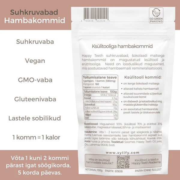 Использование: Эстонская стоматологическая ассоциация рекомендует зубные конфеты Xylify Happy Teeth с ксилитом и эритритом в качестве части ежедневного ухода за полостью рта. Рекомендуется принимать 1-2 пастилки после каждого приема пищи, перекуса или напитка. Дайте пастилкам медленно раствориться во рту. Малый и удобный формат позволяет их использование в любой ситуации.