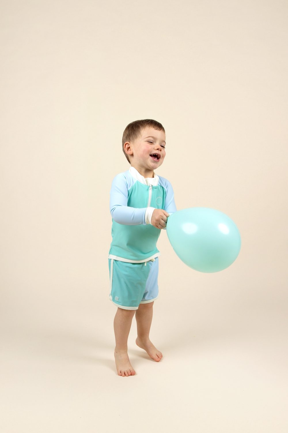 Шорты имеют УФ-сенсор, который меняет цвет по мере усиления солнечного излучения (чем более фиолетовый оттенок, тем больше необходима дополнительная защита) — простой способ научить детей заботиться о воздействии солнца.