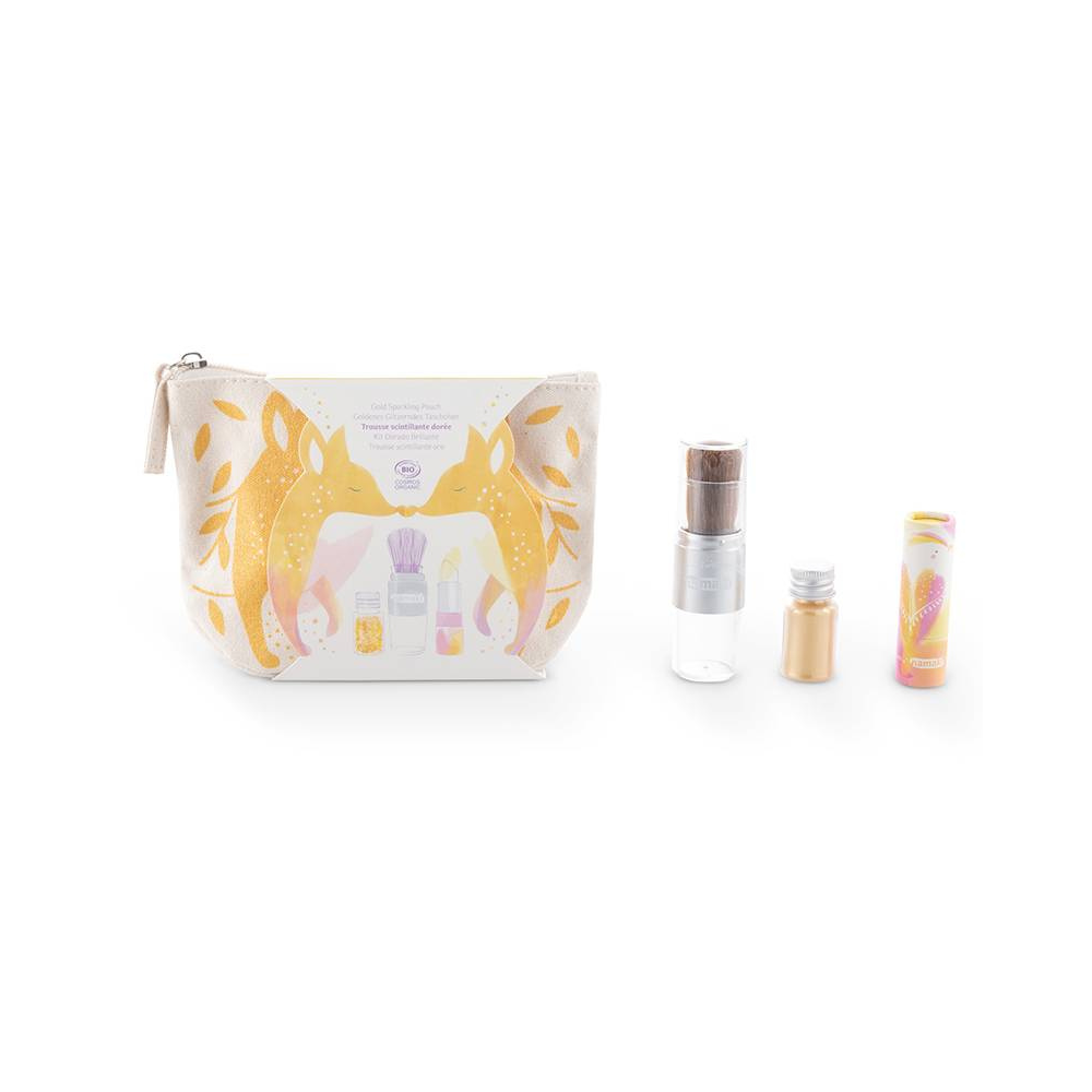 Красивая сумочка с золотым оформлением из органического хлопка наполнена всем необходимым, чтобы блистать на празднике. В комплекте: – пустая волшебная кисточка – запасной золотой блестящий порошок и бесцветная перламутровая губная помада, а также косметичка.