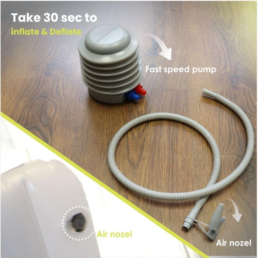 Быстрое и лёгкое надувание — забудьте о трудностях с ручным надуванием бортиков. Наш надувной дорожный матрас для малышей комплектуется удобным насосом, который позволяет надуть кровать за считанные минуты.