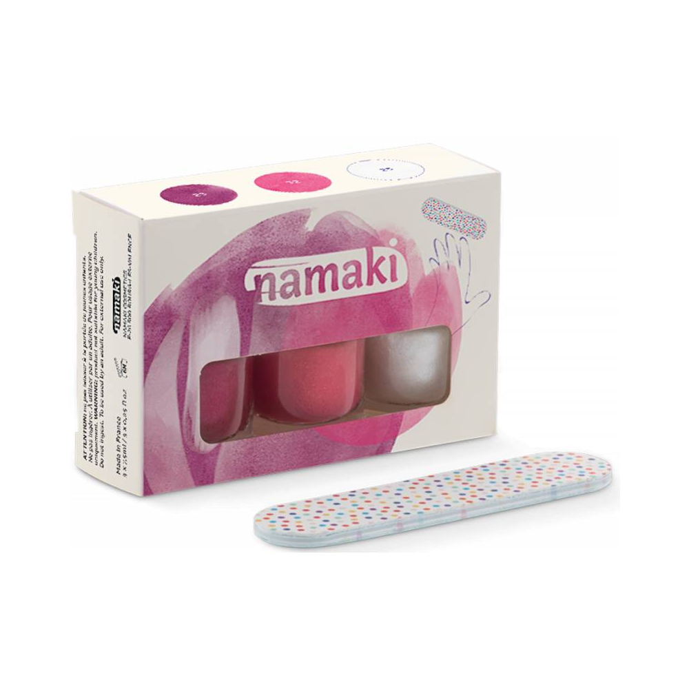Водная детская основа для лака для ногтей, которую можно снимать, словно наклейку. Namaki разработала экологичный, снимающийся лак на водной основе, не содержащий растворителей и ароматизаторов — дети могут играть, не рискуя своим здоровьем и не вредя планете. В этот чудесный набор входят самые популярные цвета коллекции, чтобы дети могли накрасить ногти так, как подходит их играм, интересам и одежде: Морелло черешня — Сиреневый — Розовый с блестками.