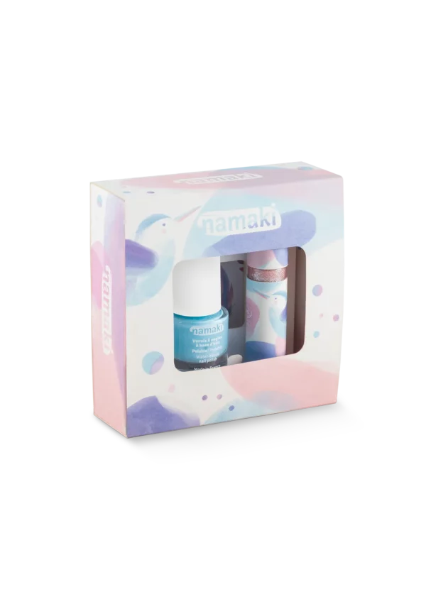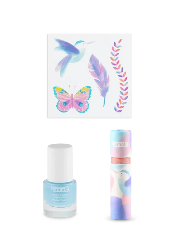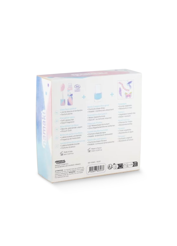 Три любимца детей в одном наборе: блеск для губ с ароматом персика, блестящий синий лак для ногтей и эксклюзивный лист с татуировками – все с натуральными ингредиентами и дружественной к коже формулой, подходящей для чувствительной кожи.