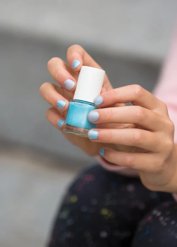 - Блестящий синий лак для ногтей – снимается как наклейка, не требуется средство для снятия