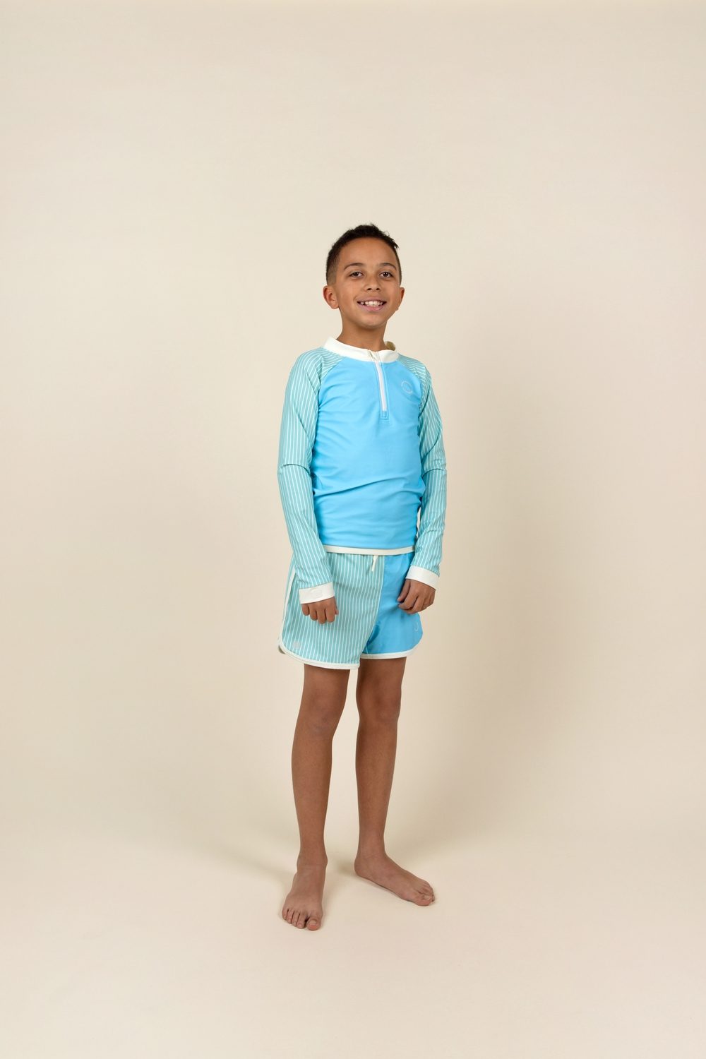 Длинно-рукавная ткань UPF 50+ обеспечивает полную защиту от лучей UVA и UVB и помогает сохранить чувствительную кожу детей в безопасности — естественным образом, без дополнительной обработки.