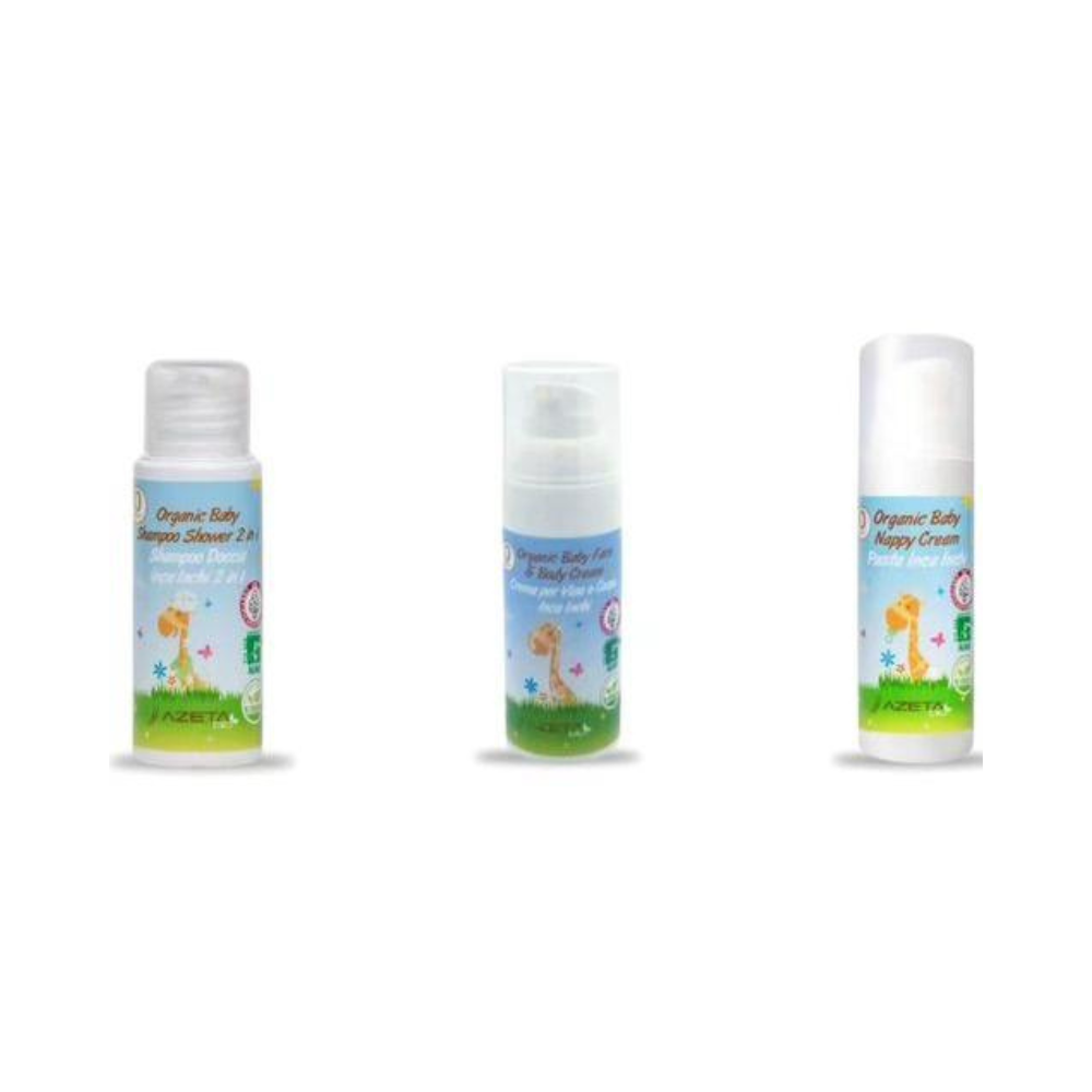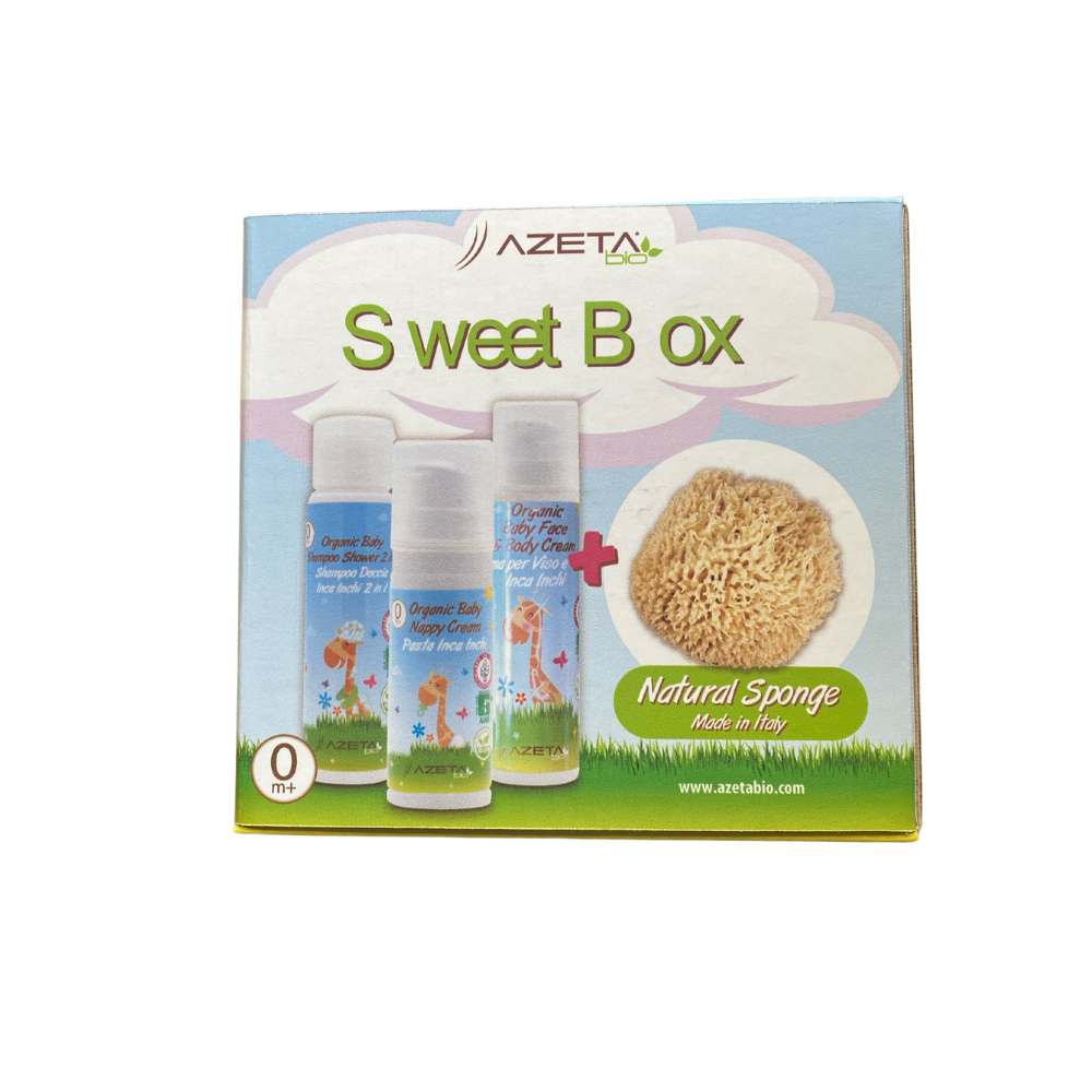 Подарочный набор AZETABIO, который включает в себя органический ухаживающий крем для малышей с алоэ вера и маслом сача инчи, органическое ухаживающее средство для мытья тела и волос для малышей с алоэ вера и маслом сача инчи, а также натуральный ухаживающий и защитный крем под подгузник с алоэ вера и натуральную детскую губку для купания в подарок. Это идеальная идея подарка на день рождения или Рождество для ребенка.