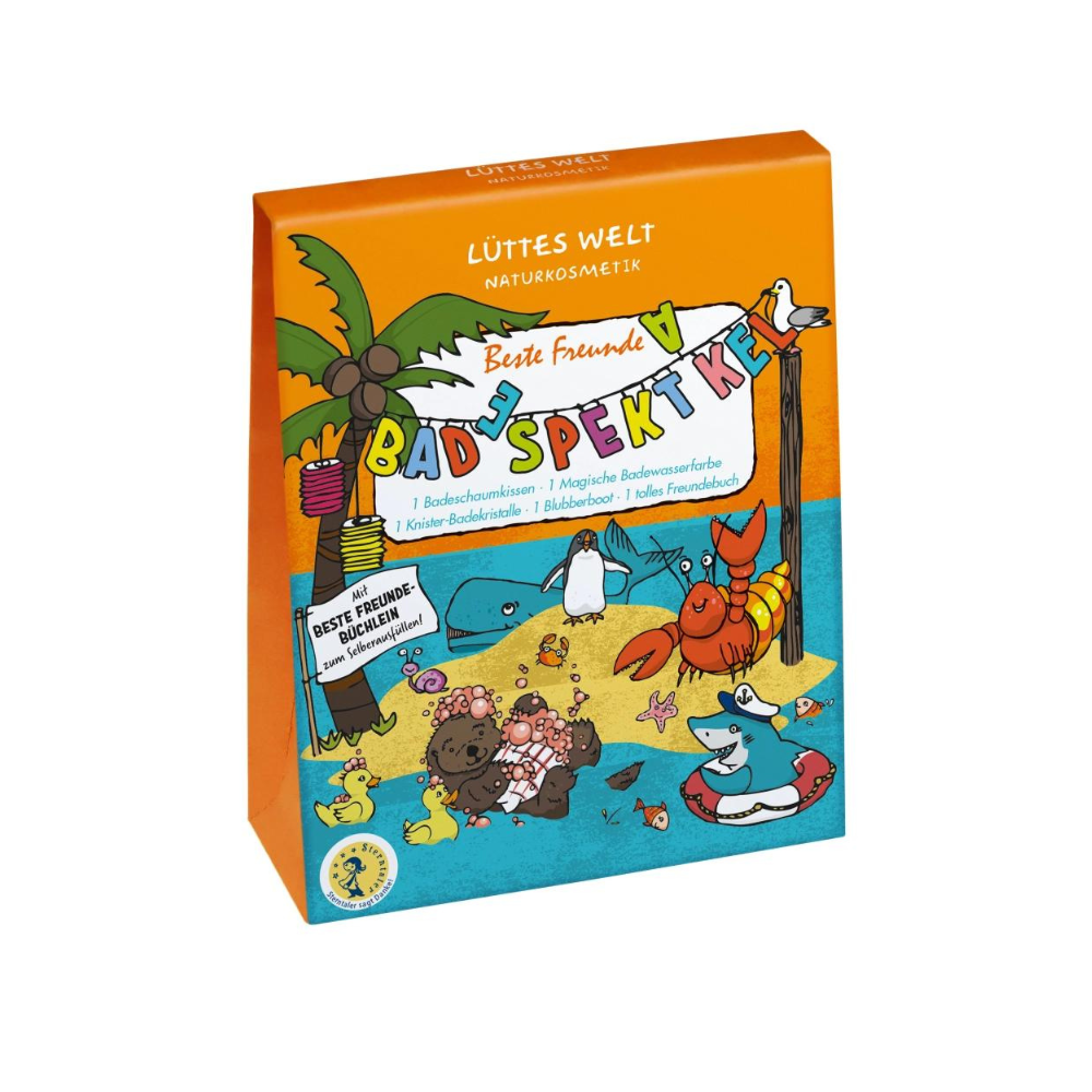 Подарочный набор для купания Lüttes Welt Best Friends. Набор содержит четыре продукта с пеной, шипением и эффектом смены цвета. В набор входит подушка-пена для ванны, окрашивающая воду в кораллово-красный цвет, волшебный краситель для воды с эффектом неожиданной смены цвета, потрескивающие кристаллы для ванн и пузырьковый кораблик, движущийся вместе с пеной.