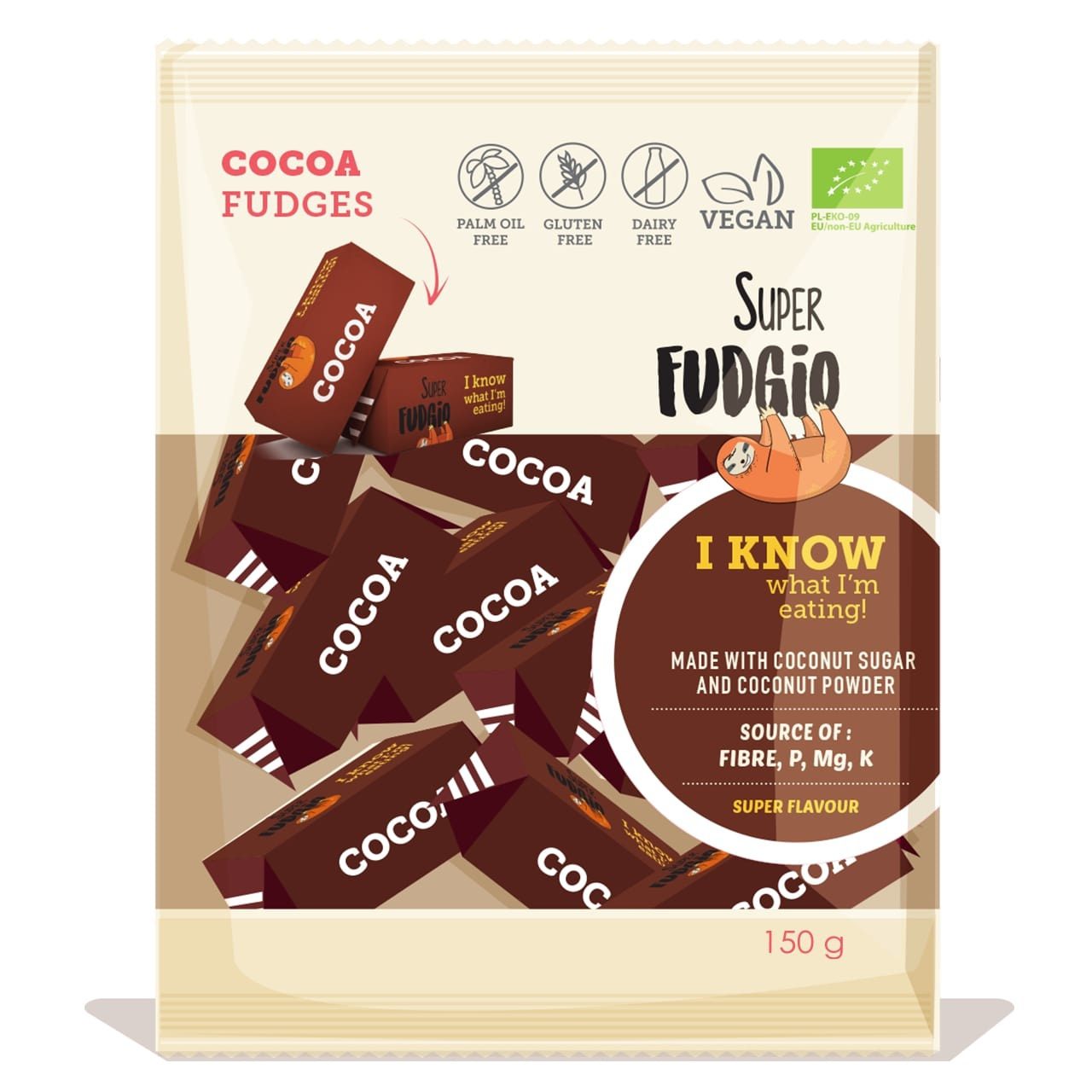Конфеты Fudgio с какао отличаются ярким вкусом и богатым содержанием какао. Изготовлены только из органических ингредиентов. Не содержат глютен. Не содержат пальмовое масло.