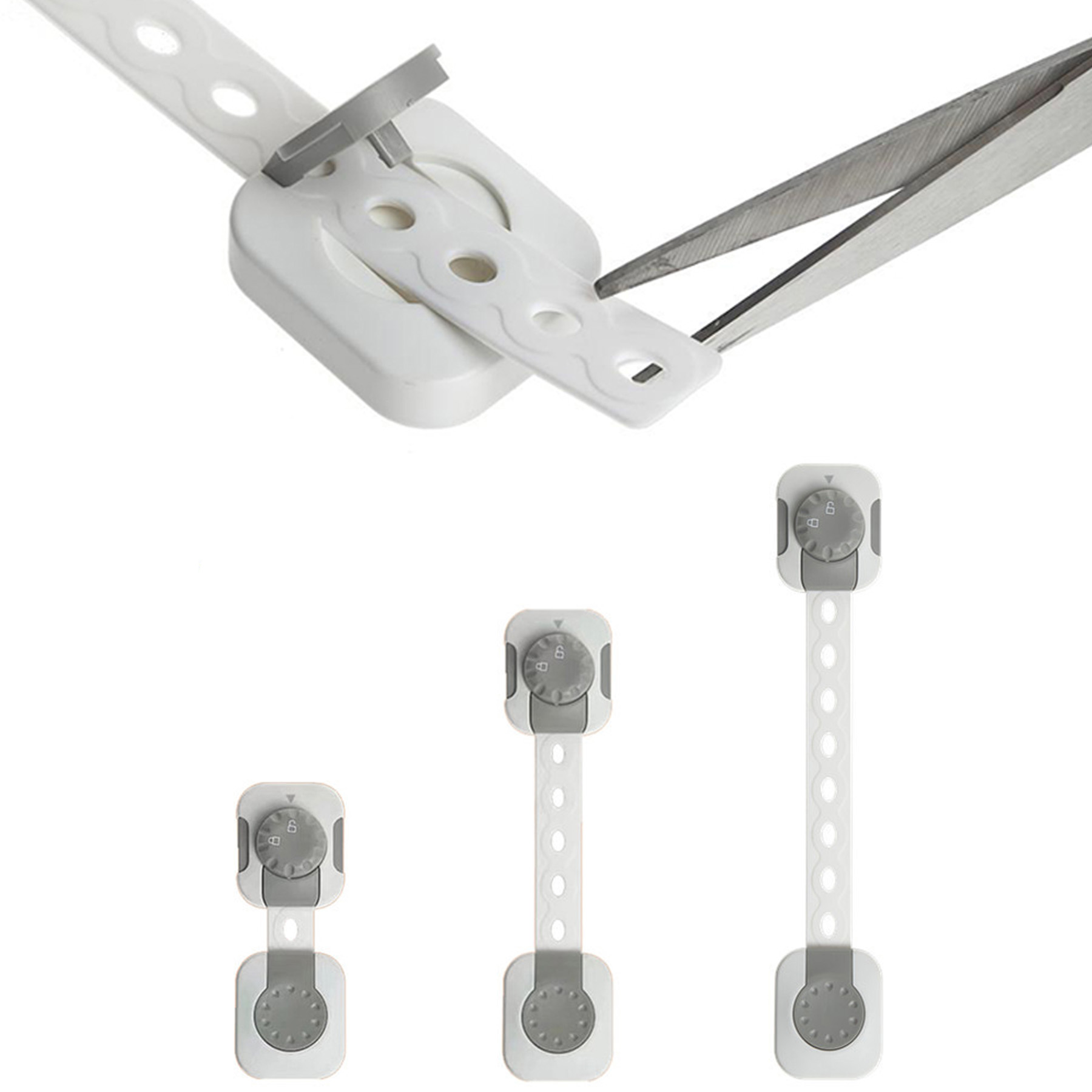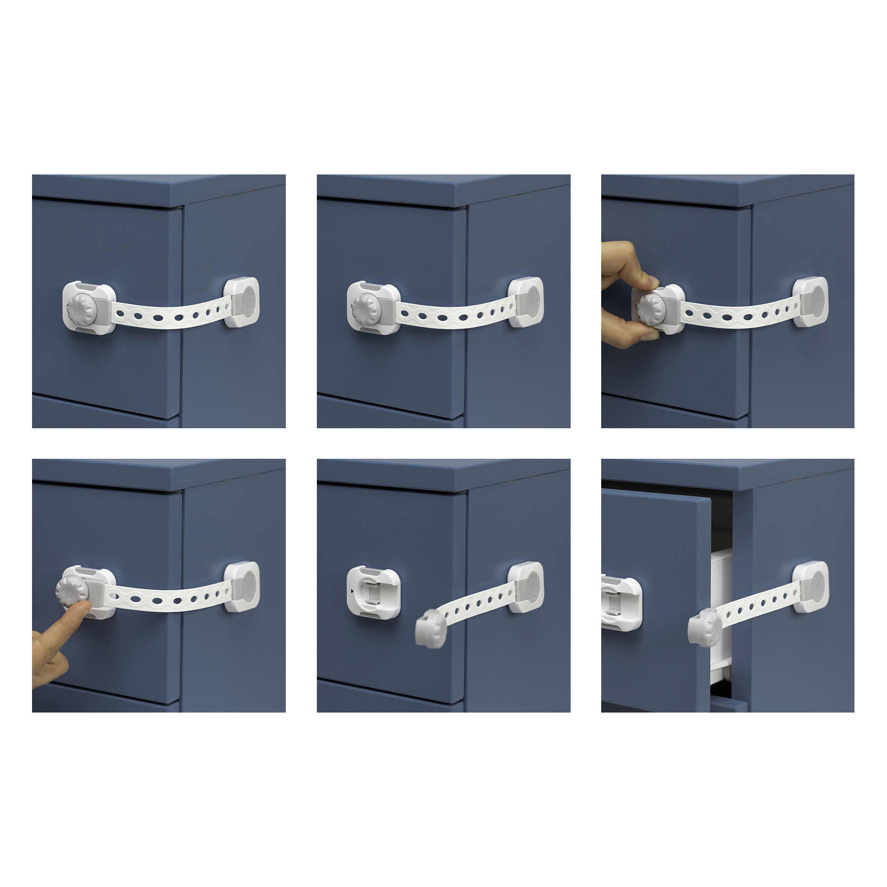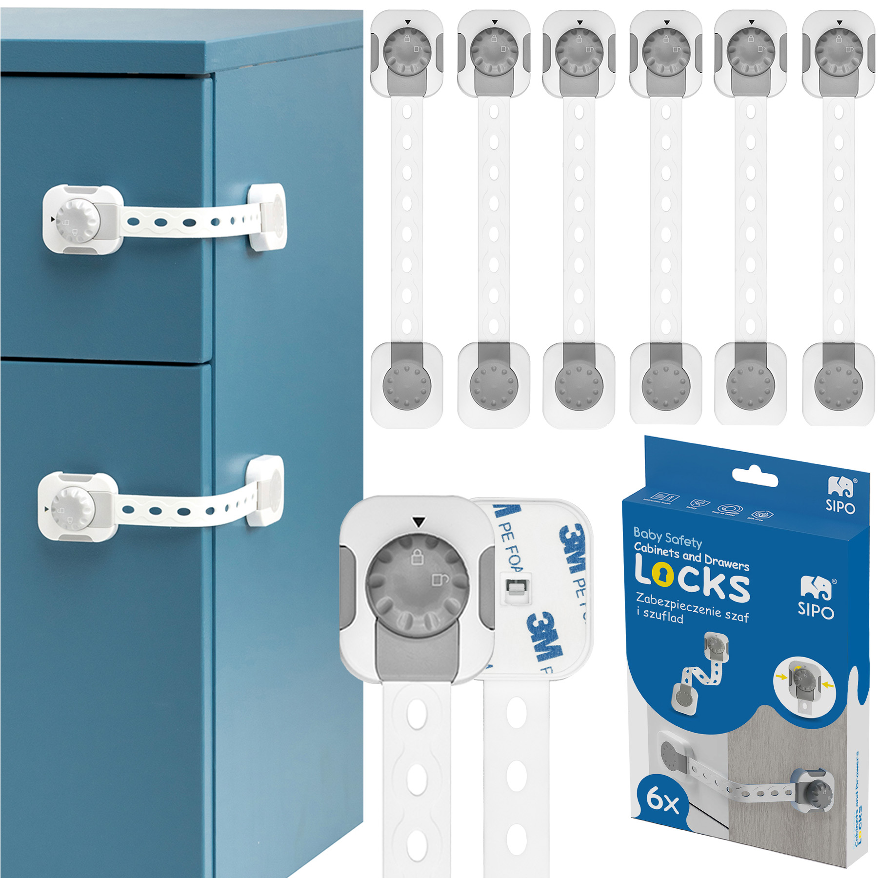 Набор из 6 регулируемых замков SIPO для шкафов с простой функцией блокировки, которая обеспечивает быстрый доступ для взрослых, но защищает от открытия малышей. Замки имеют регулируемую длину. Это практичное и простое решение, обеспечивающее безопасность вашего ребенка, предотвращая доступ к опасным предметам или веществам, хранящимся в шкафах и ящиках.