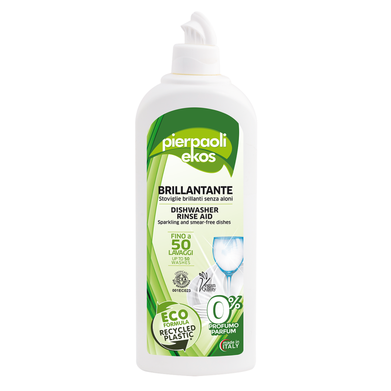 Ополаскиватель для посудомоечных машин Pierpaoli Ekos подходит для использования при любой жёсткости воды. Оставляет посуду сухой и блестящей, без известковых отложений и разводов. 97% ингредиентов имеют натуральное происхождение. Продукт сертифицирован ICEA, что гарантирует отсутствие веществ, опасных для человека и окружающей среды. Содержание никеля, хрома и кобальта <0,00004%. Одного флакона ополаскивателя хватает до 50 моек. Способ применения: Налейте жидкость в отсек для ополаскивателя посудомоечной машины и убедитесь, что он после этого плотно закрыт. Регулируйте дозировку в зависимости от жёсткости воды.