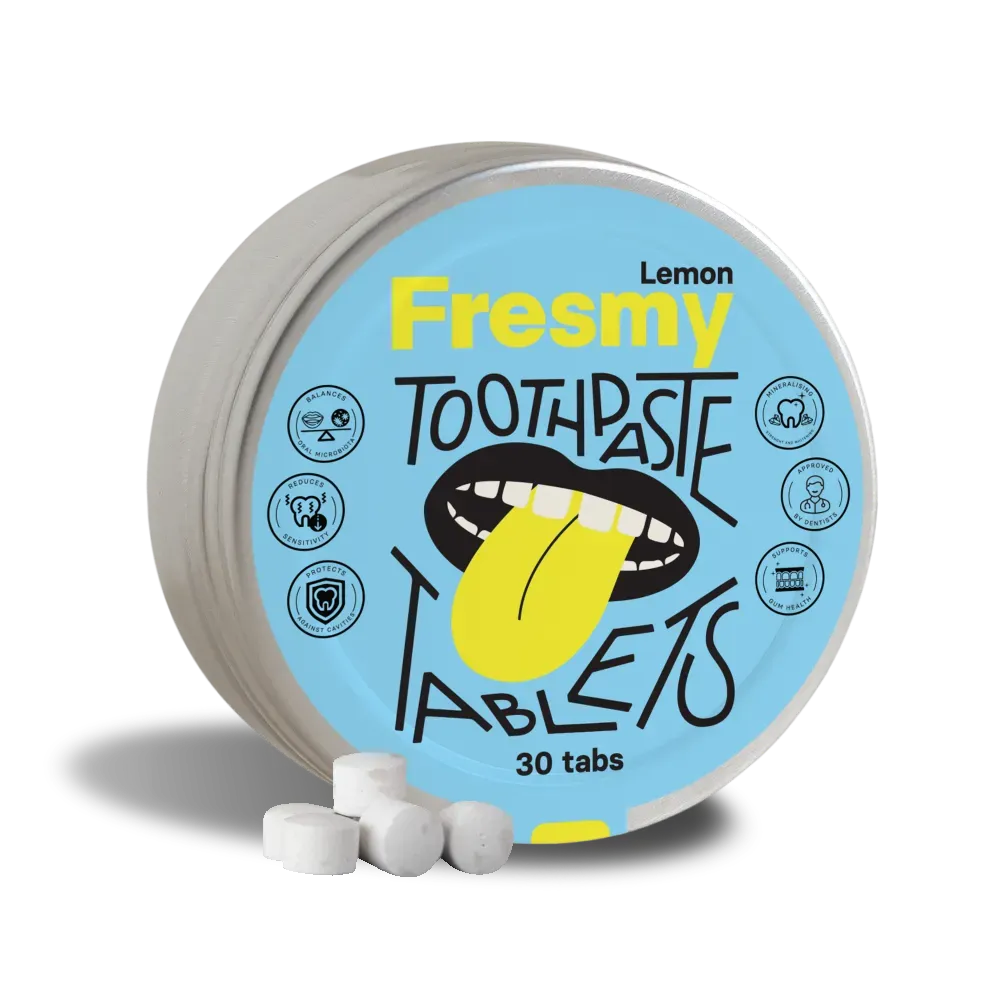 Лимонные таблетки для зубной пасты содержат гидроксиапатит (HAp), который является нетоксичной альтернативой фтору. Он естественным образом восстанавливает эмаль зубов.