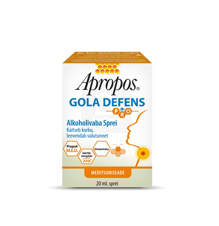 Спрей без спиртаnЗащищает горло, облегчает больnМедицинское изделиеnnБлагодаря защитному комплексу APM, состоящему из “мукоадгезивных полимерных активных веществ”, спрей Apropos Gola Defens PRO без спирта создает защитную мукоадгезивную пленку, которая ограждает слизистую оболочку ротоглотки от вредных внешних факторов, увлажняя и успокаивая ее. Благодаря пленкообразующему действию и наличию Propolis M.E.D.® спрей Apropos Gola Defens без спирта защищает горло от внешних воздействий, снижая болевые ощущения, связанные с раздражением горла при фарингите и тонзиллите.nПродукт не содержит спирта и поэтому подходит для детей.nnСпособ примененияnС 3 лет: рекомендуется по 2 впрыскивания за прием, повторять до 4 раз в день. Взрослым: рекомендуется по 4 впрыскивания за прием, повторять до 4 раз в день.nПеред использованием встряхнуть.nnСоставnВода, экстракт прополиса в гидроглицерине, растительный глицерин, экстракт черной смородины в гидроглицерине, экстракт подорожника в глицерине, защитный комплекс APM (камедь целлюлозы, ксантановая камедь, гиалуроновая кислота, камедь акации, экстракт прополиса), краситель (карамель), ароматизатор, консервант (сорбат калия), подсластитель (сукралоза).nnПредупреждения и меры предосторожностиnНе использовать при индивидуальной непереносимости или аллергии на любой из компонентов.nХранить в недоступном для детей месте. Хранить при комнатной температуре в сухом месте, вдали от источников тепла и солнечных лучей.nНе выбрасывать в окружающую среду после использования.nСрок годности указан для невскрытого и корректно хранимого средства.nnУстройство и комплект поставкиnФлакон-спрей; 20 мл спрея