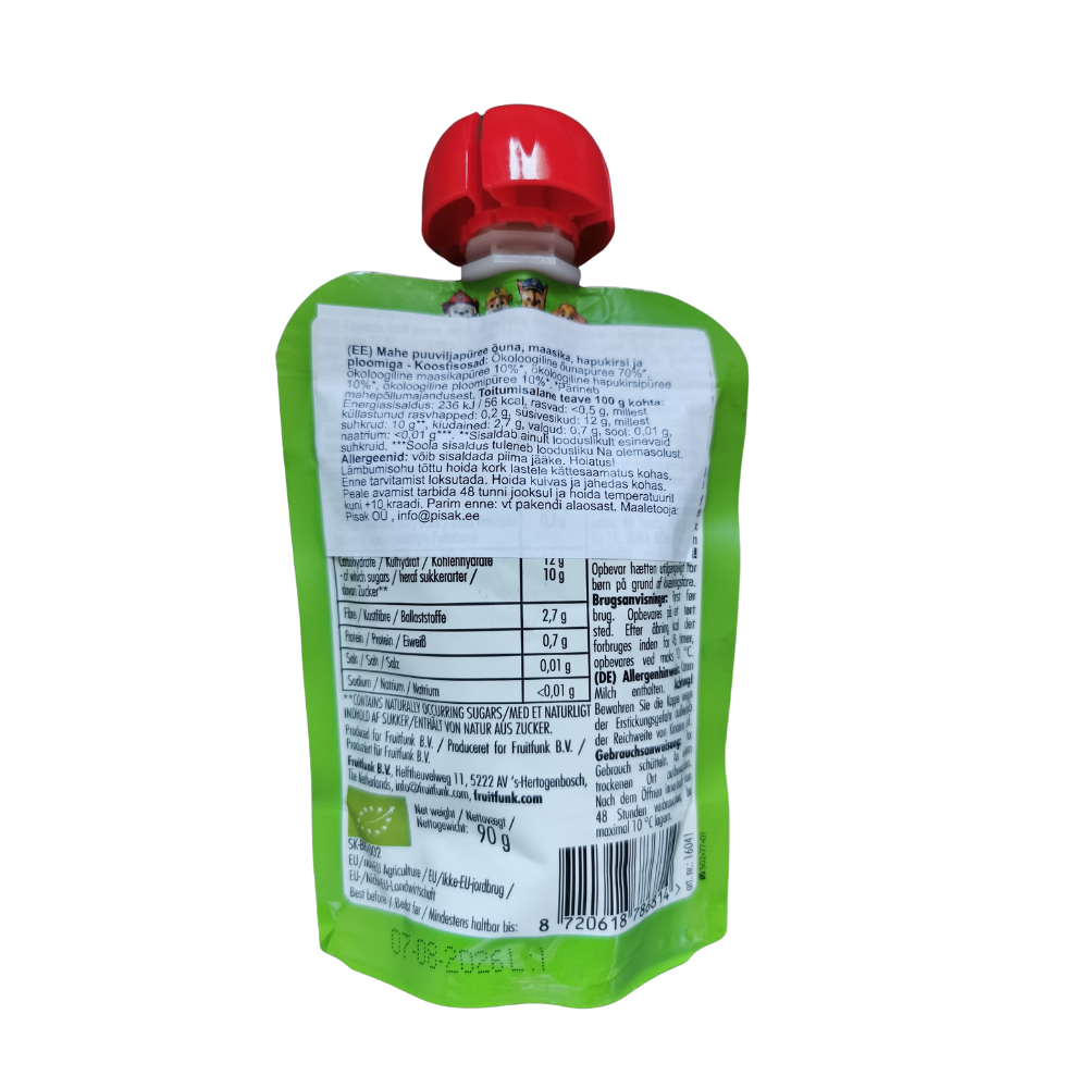 BANANA BITE: фрукты 183 г* (концентрированное грушевое пюре 77 г*, концентрированный яблочный сок 69 г*, банановое пюре 37 г*), цитрусовая клетчатка, желирующий агент: фруктовый пектин, натуральные ароматизаторы. *г используется для 100 г готового продукта. Пищевая ценность на 100 г: Энергетическая ценность: 1355 кДж/320 ккал, жиры: 1,1 г, из них насыщенных жирных кислот: 0,2 г, углеводы: 74,9 г, из них сахаров: 62,8 г*, клетчатка: 6,8 г, белки: 1,8 г, соль: 0,1 г. *Только натуральный сахар, содержащийся во фруктах.