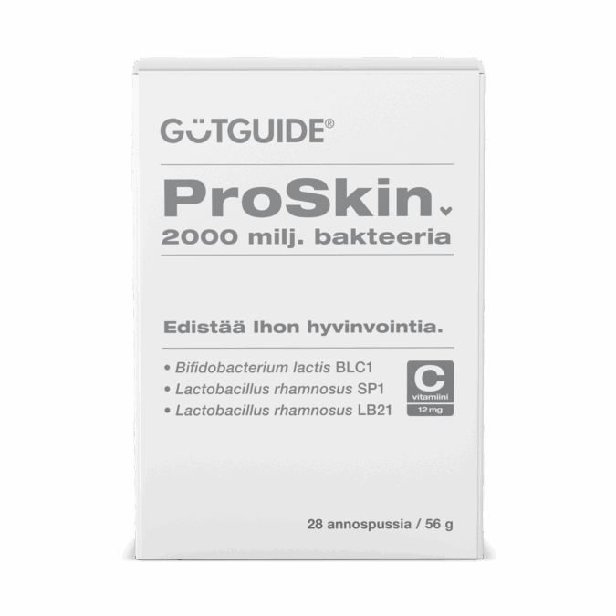 GutGuide® ProSkin — это инновационная пищевая добавка, которая сочетает в себе три специальные штамма молочнокислых бактерий и витамин C для поддержки чувствительной кожи через кишечник. ProSkin содержит только лиофилизированный порошок молочнокислых бактерий и мальтодекстрин, полученный из кукурузы, который служит носителем. Продукт не содержит искусственных ароматизаторов, вкусовых добавок и других добавок.