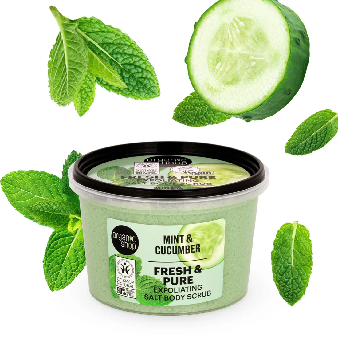 Скраб для тела, обогащенный органическими экстрактами перечной мяты и огурца, обеспечивает коже освежающий, увлажняющий и выравнивающий уход.