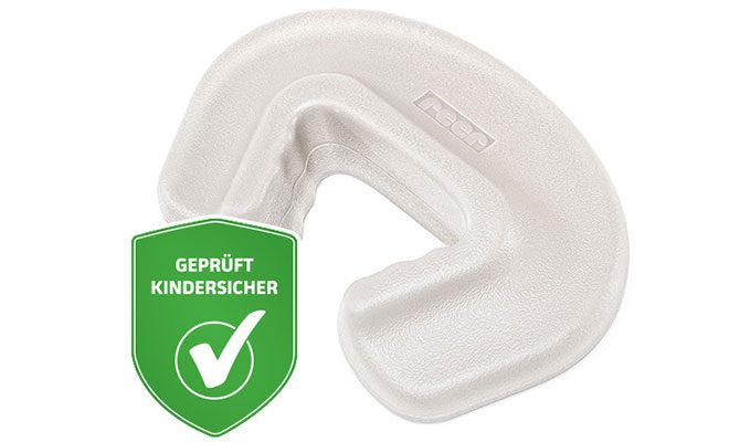 Ограничитель изготовлен из прочного и гибкого пластика, устойчивого к укусам и сохраняющего свою форму даже при длительном использовании. Соответствует европейскому стандарту безопасности DIN EN 16654:2018, что гарантирует его надёжность даже после долгого срока службы. Благодаря нескользящему материалу и специальной рифлёной поверхности ограничитель крепко держится на двери, а его установка не требует сверления, клея или использования винтов.