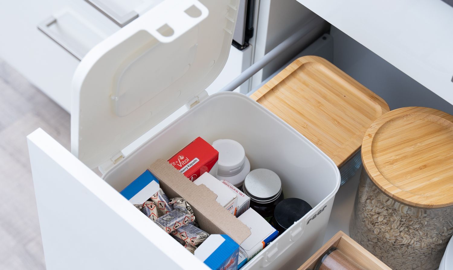 Коробка надёжно хранит таблетки для стиральных и посудомоечных машин, батарейки, лекарства и другие мелкие опасные предметы, которые ребёнок может случайно проглотить. Таким образом, потенциально опасные вещи находятся в безопасном и аккуратном месте.