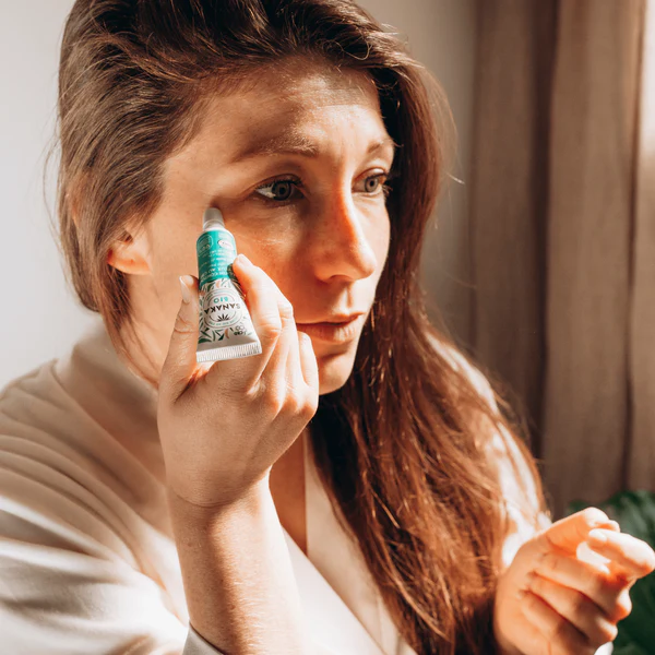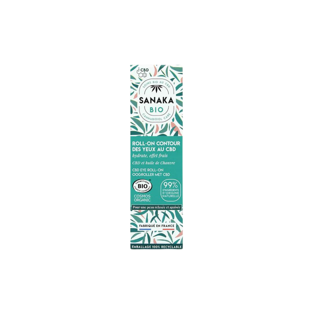 Роллер для кожи вокруг глаз SANAKA на основе CBD*, гиалуроновой кислоты и масла конопли не содержит отдушек, сертифицирован органикой COSMOS и состоит на 99% из ингредиентов натурального происхождения.