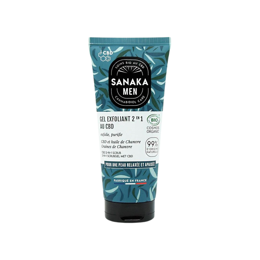 SANAKA MEN 2 в 1 отшелушивающий гель, сертифицированный ORGANIC COSMOS и состоящий на 99% из ингредиентов натурального происхождения, содержит комплекс КБД* и органического масла конопли для удаления загрязнений, бережного очищения и отшелушивания кожи.