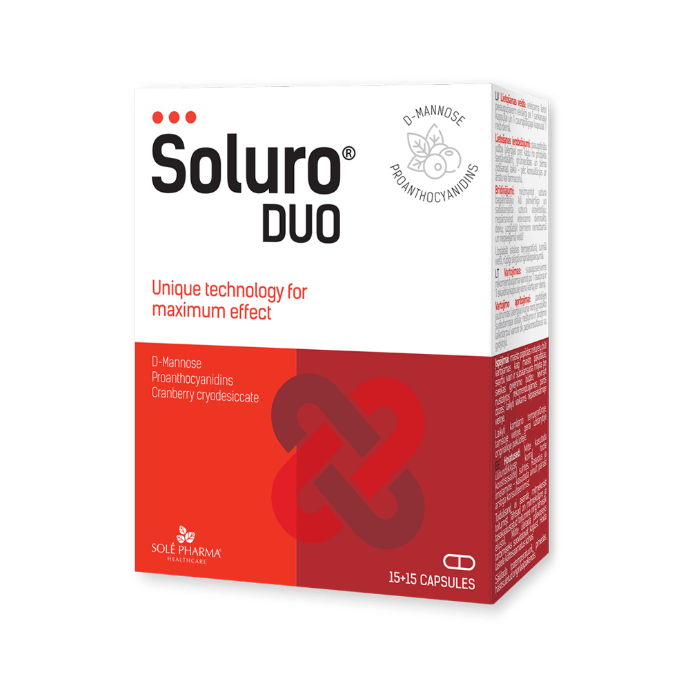 Уникальное сочетание концентрированных проантоцианидинов клюквы (PAC) и Д-маннозы, содержащиеся в капсулах Soluro Duo, эффективно блокирует все адгезионные придатки бактерий, вызывающих цистит. Это предотвращает прилипания патогенных бактерий к слизистой оболочке мочевого пузыря и проникновение в клетки, тем самым предотвращая развитие цистита.