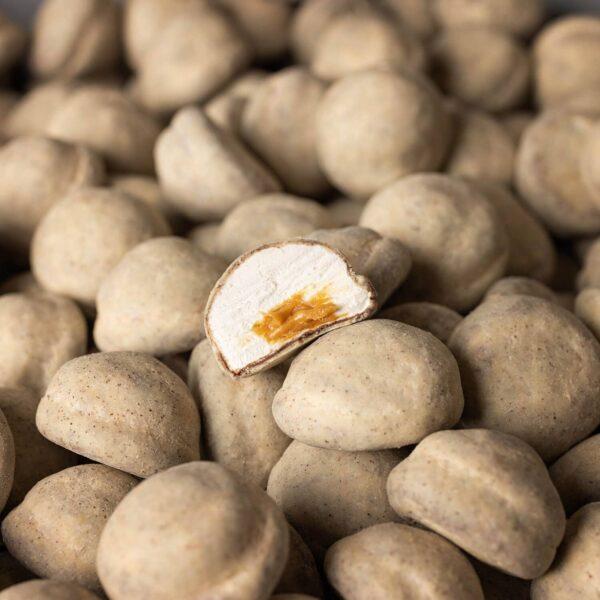 Зефир с карамельной начинкой в бельгийском белом шоколаде и карамели. Между слоями шоколада посыпан кофе — необыкновенное лакомство для каждого любителя кофе!