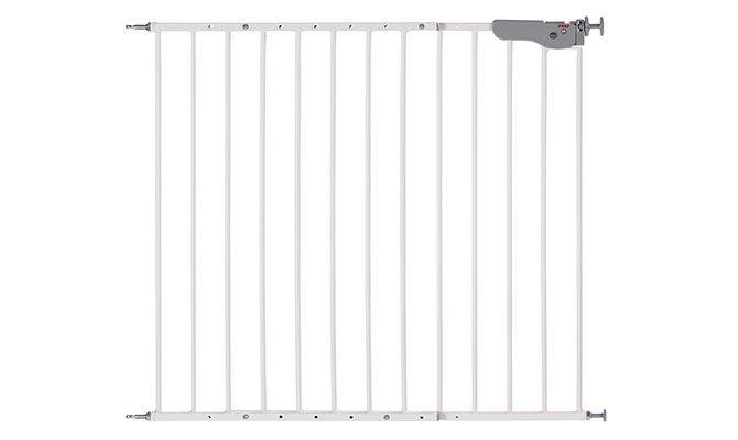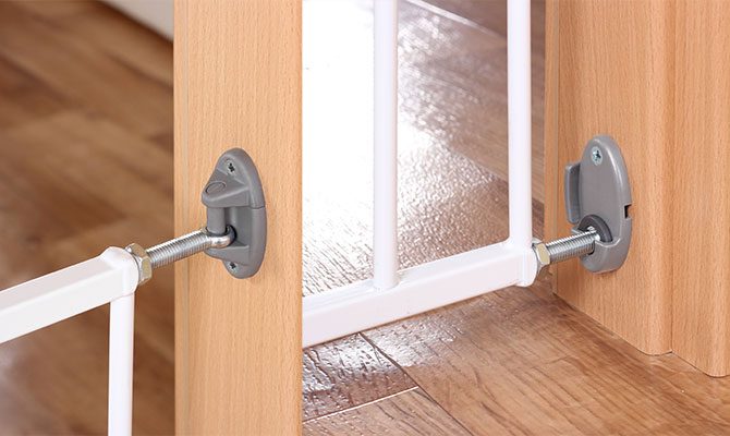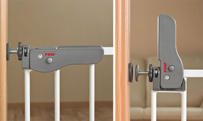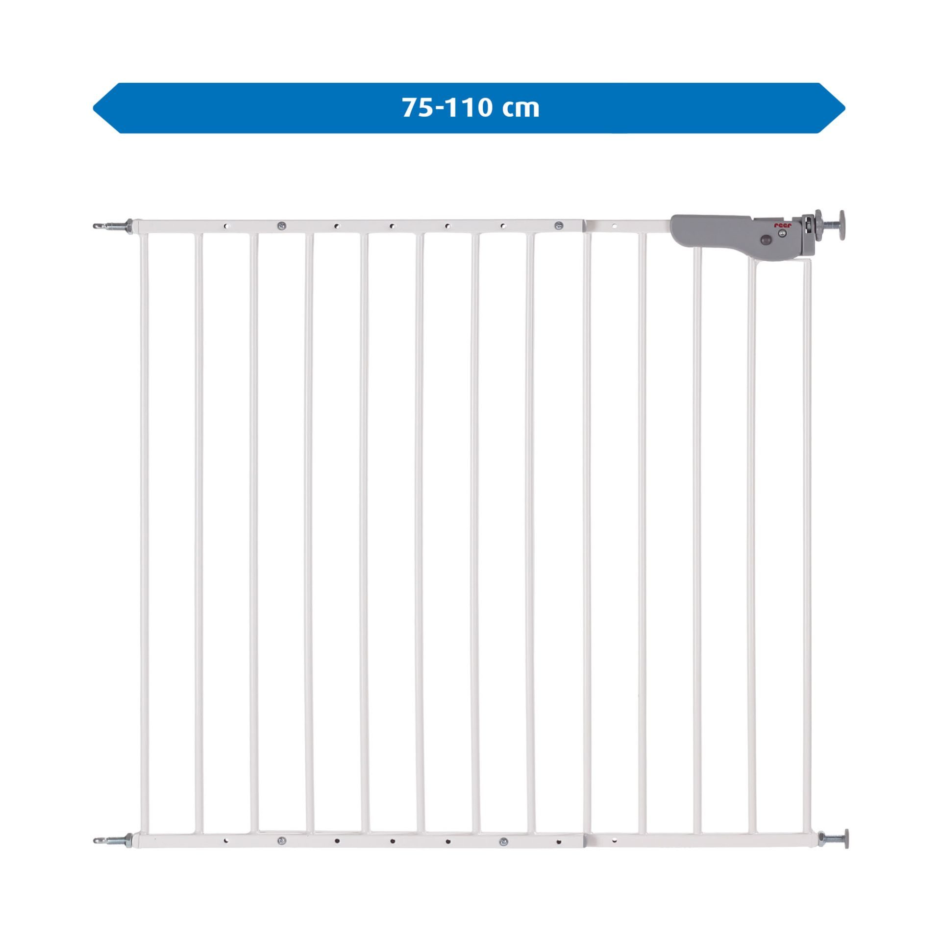 Ширина ворот плавно регулируется в диапазоне 75–110 см, что позволяет адаптировать их к проёмам различной ширины без дополнительных расширителей. Они идеально подходят для перекрытия как верхней, так и нижней части лестницы, а также более широких дверей или проходов. Благодаря регулируемой 4-точечной системе крепления ворота можно надежно и стабильно установить даже на неровных стенах или плинтусах – каждую точку крепления можно отрегулировать индивидуально.