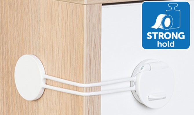 Специально разработанная клейкая лента обеспечивает надежную фиксацию без сверления и шурупов. При необходимости замок можно снять, не повреждая мебель.