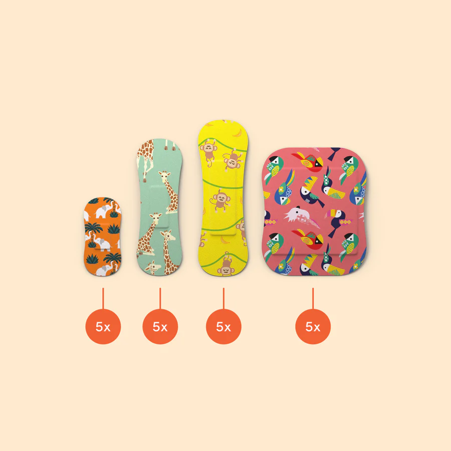 Уникальные, забавные дизайны пластырей в стиле джунглей — слон, жираф, обезьяна и разноцветные птицы — обеспечивают не только защиту, но и радость для ребенка в любой ситуации. Благодаря запатентованной форме и мягкому, гибкому текстильному материалу пластыри удобно ложатся на небольшие участки тела.
